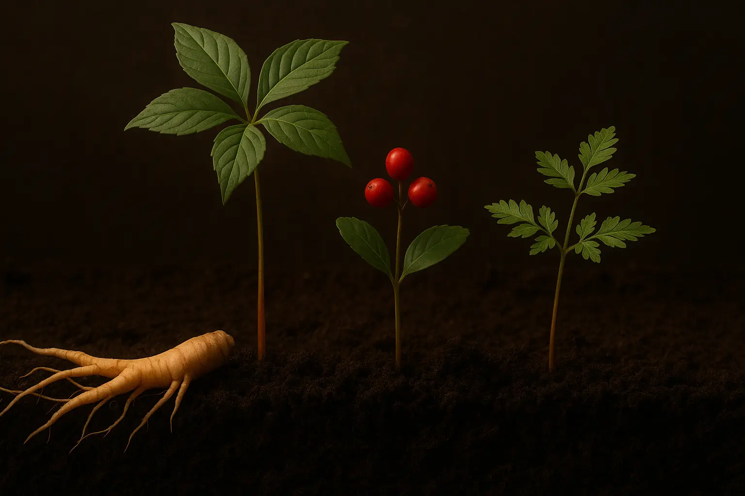 Ginseng (Panax, Siberian, American) — synonymous with vitality, mental drive, and long-term stamina.
